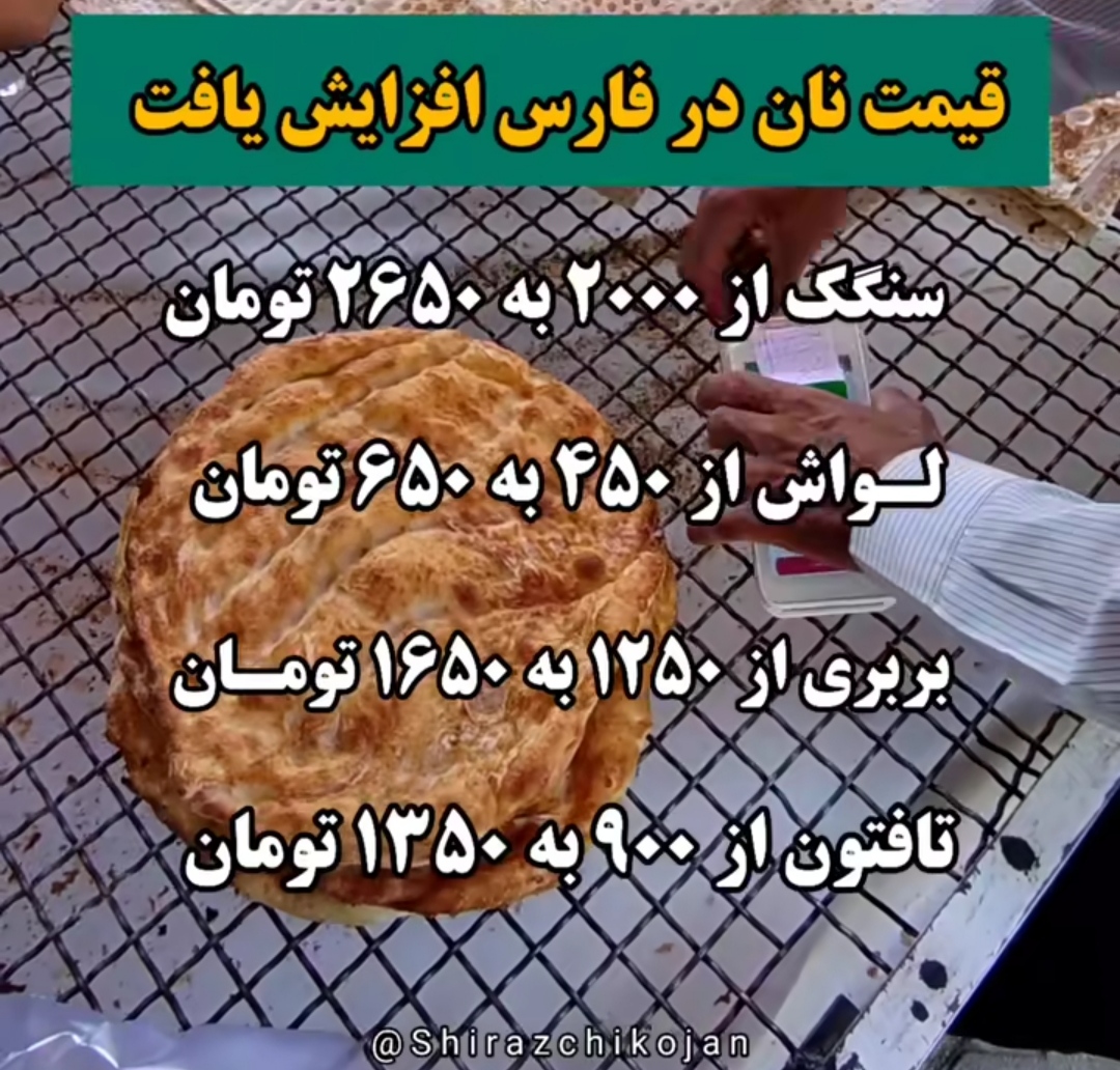 به گزارش فرکانس، رسانه های شهری شیراز در شبکه های اجتماعی از افزایش قیمت انواع نان در شیراز خبر میدهند،  این قیمتهای جدید از تاریخ هجدهم تیرماه اعمال شده است و بر این اساس تغییر قیمت چند نوع از اقلام نان به این شرح است: